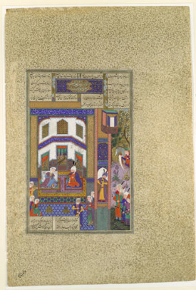 Painting attributed to ‘Abd al-Vahhab and Qadimi, “Mihrab Vents His Anger Upon Sindukht”, Folio 83v from the Shahnama (Book of Kings) of Shah Tahmasp, (ca. 1525–30). Folio from an illustrated manuscript, opaque watercolor, ink, silver, and gold on paper; 18 1/2 x 12 7/16 inches. Courtesy of the Metropolitan Museum of Art.