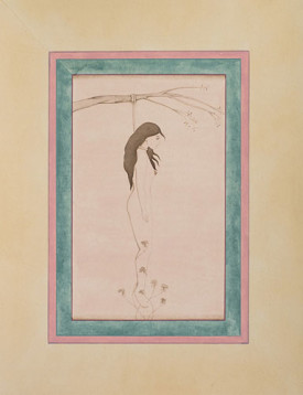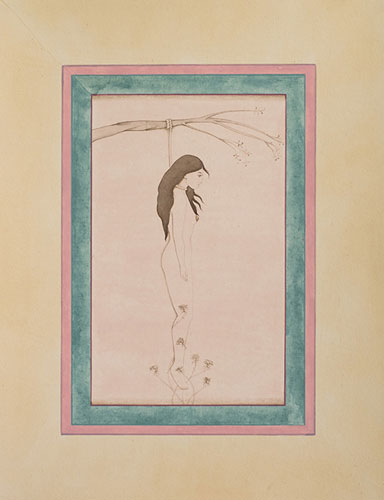 Hiba Schahbaz, Hanged With Roses, 2015. Tea, gouache, and watercolor on wasli, 12 x 10 inches. Courtesy of the artist and Thierry Goldberg.