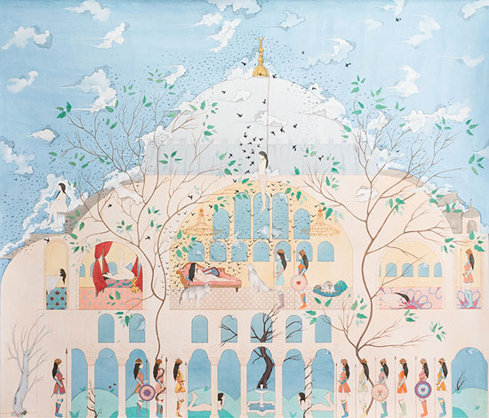 HIba Schahbaz, The Guard, 2014. Tea, gold leaf, collage, gouache, and watercolor on wasli, 45 x 35 inches. Courtesy of the artist and Thierry Goldberg.