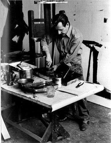 Franz Kline mixing paint in his studio. Date and author unknown.
