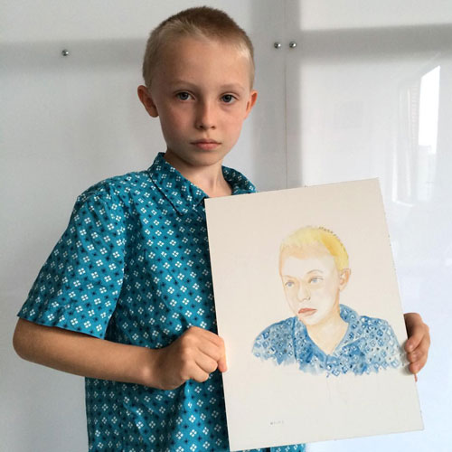 Walker Ginzel (son on Sarah Walker and Andrew Ginzel) holding “Watercolor Portrait a Day” #180 by Brenda Zlamany. Photo: Brenda Zlamany