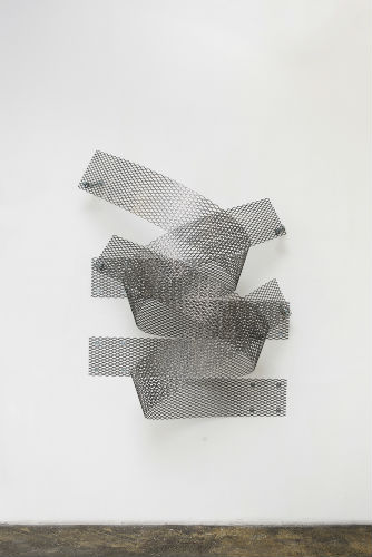 Ryan Roa, Expanded Steel Relief #5, 2015. Expanded steel, nuts bolts, washers and lag bolts, 77 x 64 x 33 inches. Courtesy gallery nine 5. Photo: Laura DeSantis-Olsson