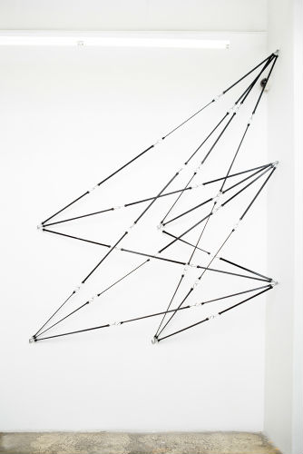 Ryan Roa, Space Drawing #40, 2015. Black rubber bungee cords and hardware, 120 x 85 x 14 inches. Courtesy gallery nine 5. Photo: Laura DeSantis-Olsson