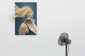 Adam Parker Smith, Crush, 2012. Digital print on canvas, human hair, electric fan, 60 x 40 inches. Courtesy of the artist and The Hole.