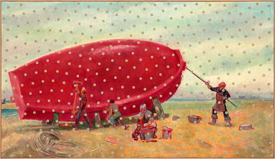 Ilya and Emilia Kabakov, The Six Paintings about the Temporary Loss of Eyesight (They are Painting the Boat), 2015. Oil on canvas, 44 x 77 inches. Courtesy of the artists and Pace.