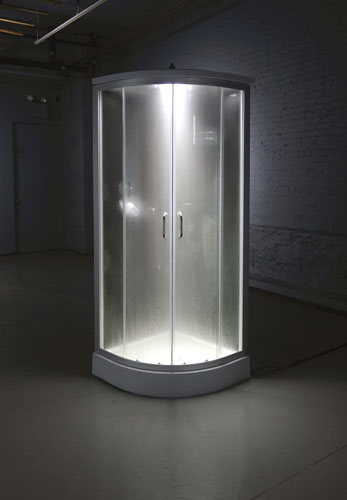 Amanda Turner Pohan, Continuous looping fluid machine for the release of my Pulsating vapors, 2016. Freestanding shower, hot water heater, water pump, Pulsating shower fluid. Courtesy of the artist.