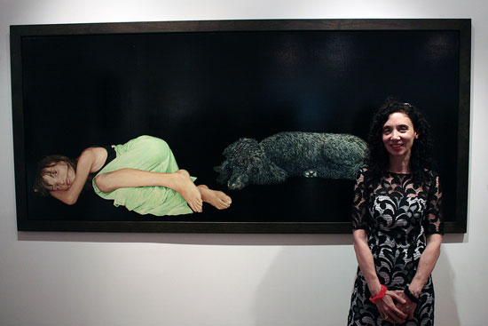 Brenda Zlamany pictured with her Portrait #120 showing the author as a young girl with the family dog, Sallie. Courtesy Hamptons Art Hub, 2013