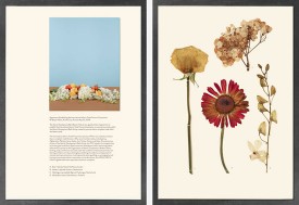 Taryn Simon, Agreement Establishing the International Islamic Trade Finance Corporation Al-Bayan Palace, Kuwait City, Kuwait, May 30, 2006 Rosa × hybrida, Hybrid Tea Rose, Ecuador, Gerbera × hybrida, Gerbera, Netherlands, Hydrangea macrophylla, Big Leaf Hydrangea, Netherlands, Dendrobium hybrid, Dendrobium, Thailand; 2015. Pigmented concrete press, dried plant specimens, archival inkjet prints, text on herbarium paper, and steel brace, 43 × 28 1/2 × 20 1/2 inches. Courtesy of the artist and Gagosian Gallery.