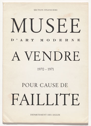 Marcel Broodthaers, Musée d’Art Moderne à vendre–pour cause de faillite (Museum of Modern Art for sale–due to bankruptcy), 1970–71. Artist’s book, letterpress dust jacket wrapped around catalogue of Kӧlner Kunstmarkt ’71 (Cologne: Kӧlner Kunstmarkt, 1971), with artist’s inscriptions, overall (folded, with catalog): 17 11/16 x 12 5/8 x 5/16 inches. © 2016 Estate of Marcel Broodthaers/Artists Rights Society/SABAM, Brussels.