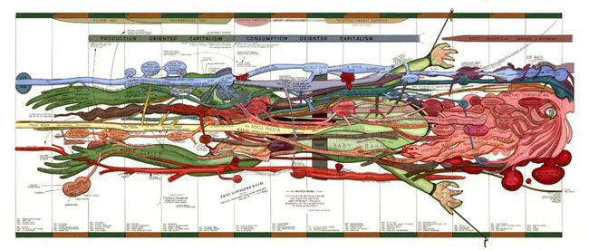 Ward Shelley, Work, Spend, Forget (Dissected Frog Polemic), v.1, 2013. Acrylic and toner on Mylar, 34 1/4 x 75 inches. Courtesy of the artist and Pierogi.