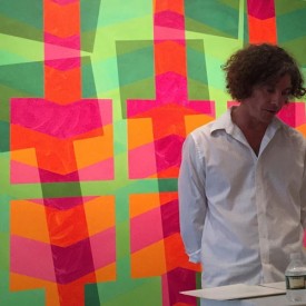 Kyle Schlesinger reading with Bill Berkson at Nate Ethier’s Speak About the Ocean exhibition, Nancy Margolis Gallery, 2016. Photo by Alison Gervais.