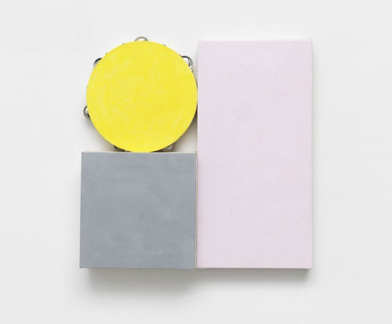 Paul Lee, Very Slightly, 2016. Tambourine, acrylic, and canvas, 20 1/2 x 20 1/2 x 3 1/2 inches. Courtesy of the artist and Maccarone, Los Angeles.