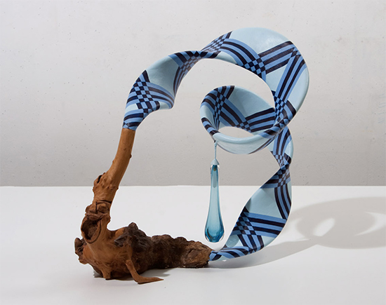 John Newman, Blue Ribbon Teardrop, 2008. Wood burl, blown glass, acrylic paint on acqua resin, wood putty, Japanese paper, papier mache, Foamcore, armature wire, string, 14-1/2 x 15-1/2 x 9 inches. The Louis-Dreyfus Family Collection