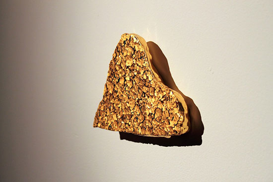 Shinji Turner-Yamamoto, Pentimenti #1, 2010. Found plaster and chipped paint fragments, 24kt gold leaf, gesso, clay bole, animal glue, tree resin, 5-1/2 × 8 × inches. Courtesy of Sapar Contemporary
