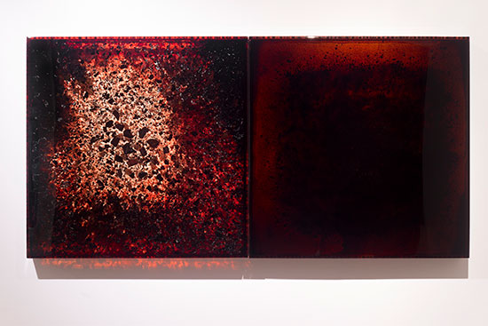 Jordan Eagles, BDBC + BD6, 2012-2014. Blood, blood dust, copper, preserved on plexiglass, UV resin, each 36 x 36 x 3 inches. Courtesy of the Artist