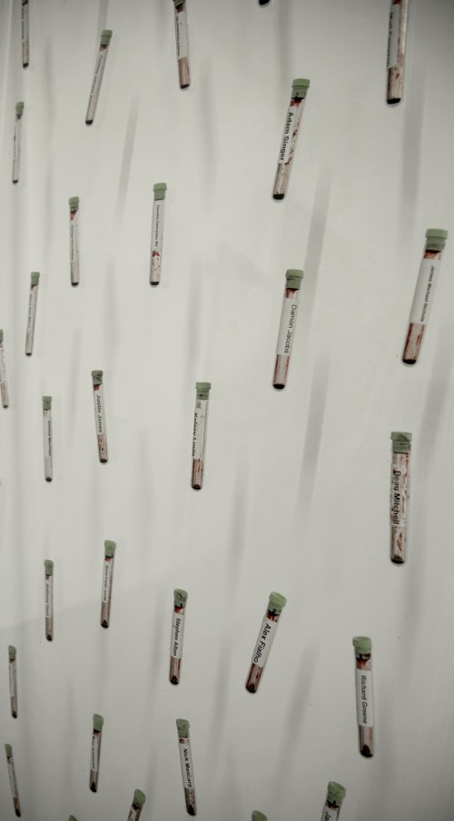 Jordan Eagles, Community Pint, 2016 (detail). 50 labeled blood collection tubes, preserved in plexiglass, UV resin, 84 x 28 x 2 inches. Courtesy of the Artist