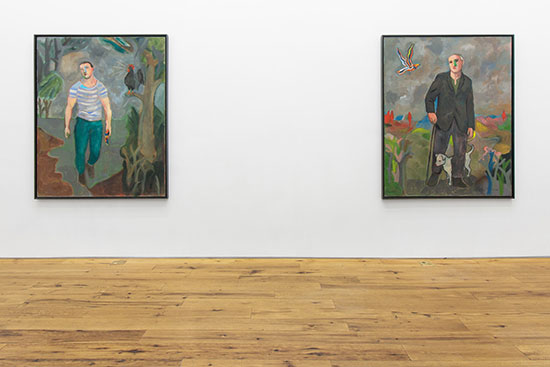 installation shot of the exhibition under review, showing The Prisoner's Dream, 2017, left, and The Wayfarer with Penguins and Seals, 2017, both oil on canvas, 63-3/4 x 51-1/4 inches. Courtesy of Marc Straus Gallery