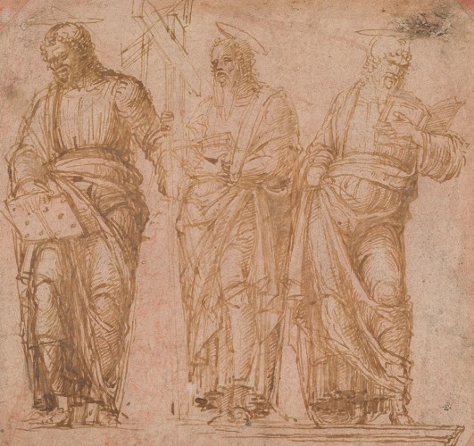 Andrea Mantegna, Three Standing Saints, ca. 1450-1455. Pen and brown ink on paper toned with red chalk. Thaw Collection, The Morgan Library & Museum