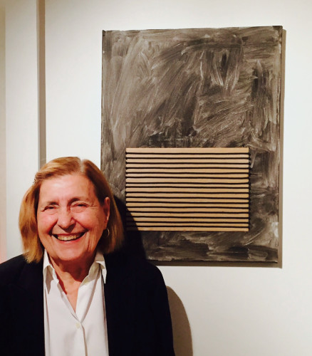 Photo of Regina Bogat with her painting Hammill, 2014. Courtesy of Zürcher Gallery, New York