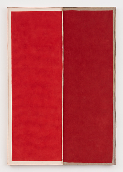 Jim Lee, Half Off (A Cream Divide), 2017.Acrylic medium, spray enamel, and staples on canvas and linen, 76 x 52 inches. Courtesy of the artist and Nicelle Beauchene Gallery, New York