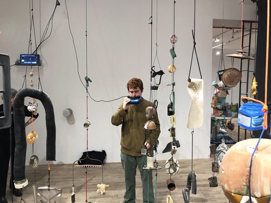 Perry Hoberman, Suspensions, 2018. Installation view with visitor preparing to wear VR goggles. Courtesy of the artist and Postmasters, New York