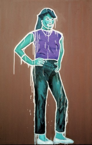 Robert Goldman/Bobby G, Untitled (Girl with Hand on Hip), 1983. Oil and aluminum paint on canvas, 72 x 50 inches. Courtesy of the artist and Hionas Gallery