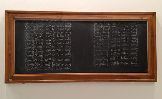 Adrian Piper, Everything #21, 2010-13 (detail). Installation, four vintage wall blackboards in lacquered wood frames and white chalk. Collection Adrian Piper Research Archive Foundation Berlin. © APRA Foundation Berlin.