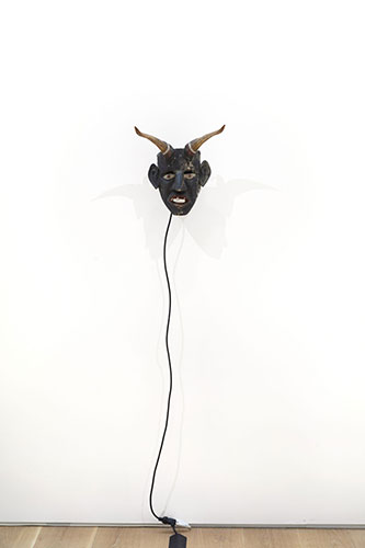 Raul Guerrero, The Rotating Yaqui Mask, 1973. Found object, painted wood, horn, with electric motor and foot pedal 18 x 20 x 15 inches. Courtesy of the artist and Ortuzar Projects.