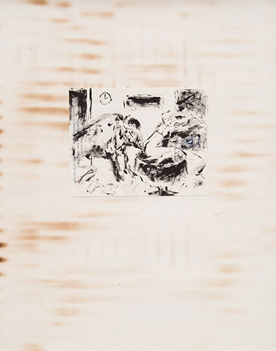 Emily Sundblad, Illustration for Living Currency, 2012, ink and YSL eyeliner on club stationary, mounted on BBQ’d paper, 14 x 11 inches