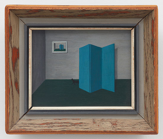 Gertrude Abercrombie, Untitled (Blue Screen, Black Cat, Print of Same), 1945. Oil on board, 8 x 10 inches. Courtesy Karma Gallery.