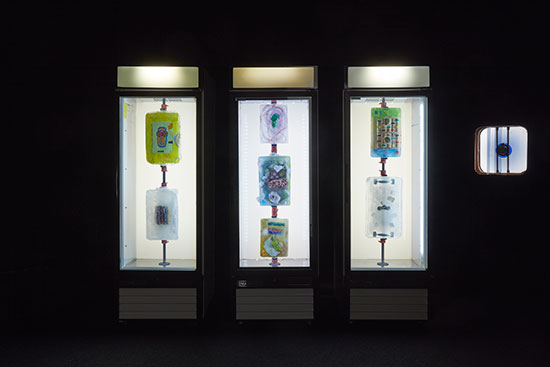 Installation shot of the exhibition under review with three untitled works from 2018, each with found objects in ice suspended in freezer with hardware. Courtesy of the artist and Gavin Brown’s enterprise