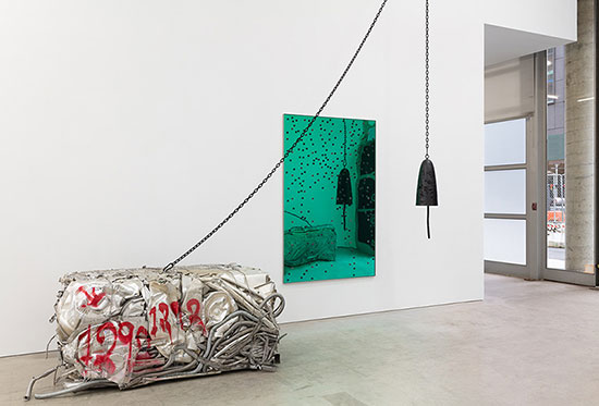 Davina Semo, “IT IS HARD, SHE SAID, “TO IMAGINE THE WORLD AS IT WAS,” 2019. Patinated cast bronze bell, whipped nylon line, wooden clapper, powder-coated chain, aluminum bale (TABOO), and hardware, overall dimensions variable. Photograph by Pierre Le Hors, courtesy of Marlborough.