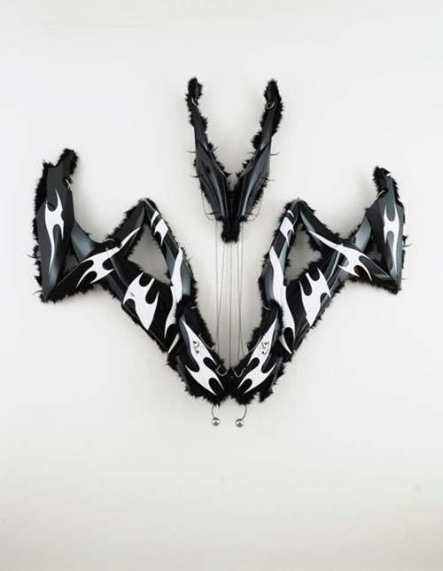 Yngvild Saeter, Spike (altar XVIII), 2019. Suzuki GSXR750 fairings, fake fur, chains, studs, metal and rings., 63 x 71 1/4 x 8 1/4 inches. Courtesy of Andréhn-Schipjenko Gallery