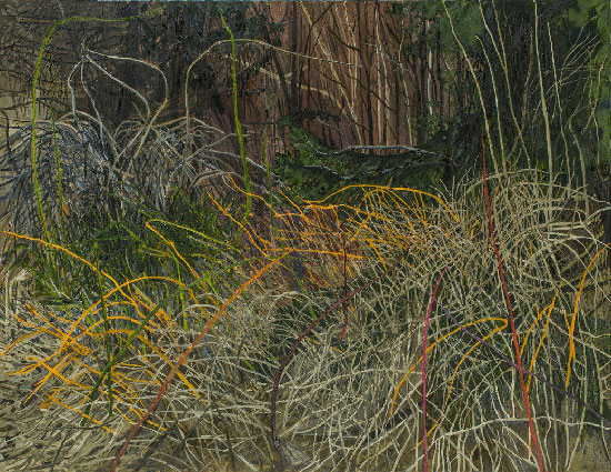 Margaret Grimes, Raspberries, Forsythia, Wild Roses and Evergreens, 2016. Oil on linen, 48 x 60 inches. Courtesy of the Artist