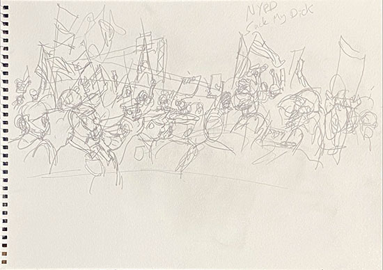 Steve Mumford, Police Try to Separate Back the Blue Demonstrators and Counterprotestors, Bayridge, Brooklyn, NY, Jul. 12, 2020, 2020. Pencil on paper, 11 x 15.5 inches. Courtesy of Postmasters Gallery and the Artist