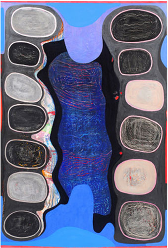 Theresa Hackett, Hiding in the Shadows (Side A), 2020 – 2021. Acrylic, spray paint, diatomaceous earth, Flashe paint, resin, marker, marble dust, and mica on aluminum panel 72 x 48 inches. Courtesy of the artist and High Noon Gallery