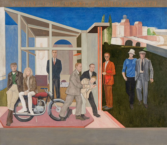 Narrative: To the Memory of Matteo Giovannetti, 1967, by Larry Day. Oil on canvas, 65 1/2 x 76 3/8 in. (Gift of Ruth Fine in honor of Irving and Miriam Brown Fine, 2020)