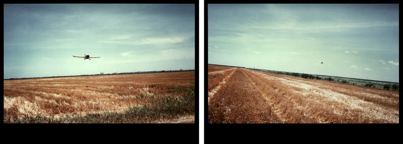 Eve Sonneman, Cropdusting, Clovis, New Mexico, 1978. Diptych photographs on Cibachrome paper, 20 x 30 inches. Courtesy of Nohra Haime Gallery.