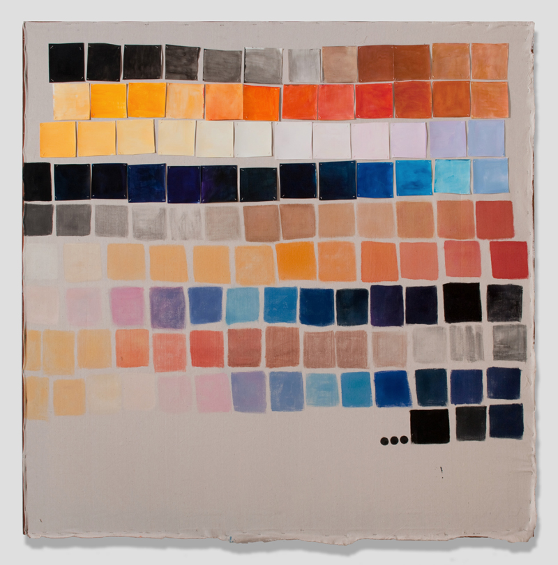 Rochelle Feinstein, 24/7 v.2.5, 2010. Gouache, paper, thread on drop cloth, 70-1/2 x 70-1/2 inches. Courtesy of On Stellar Rays